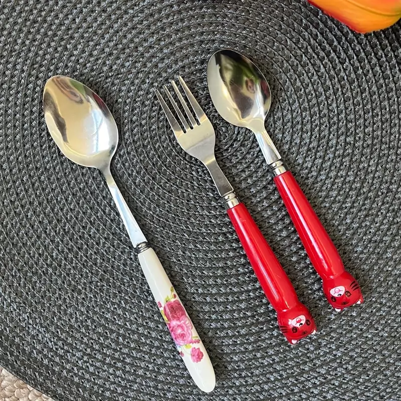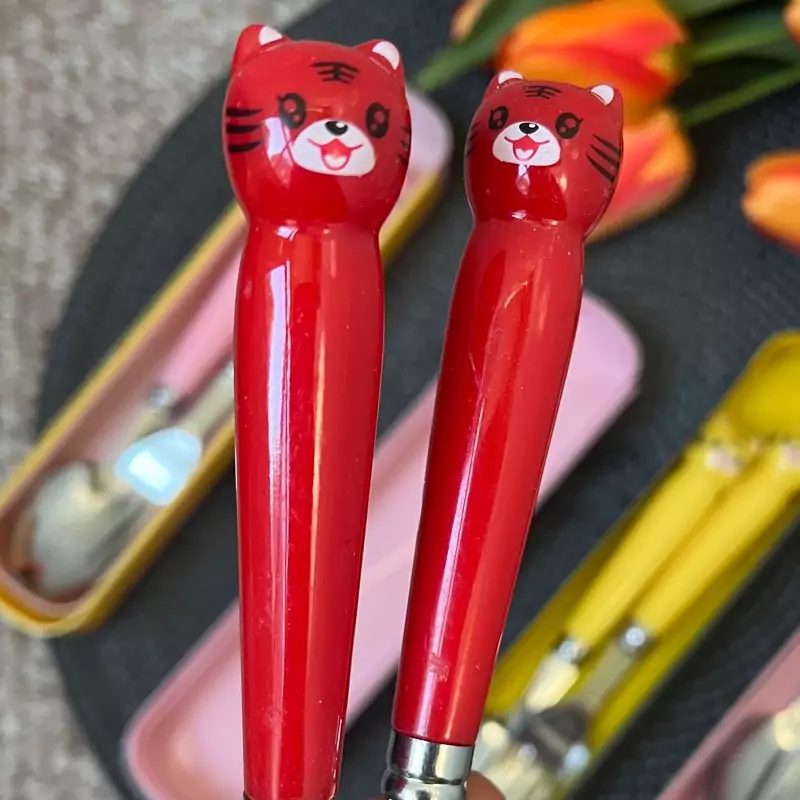 قاشق و چنگال استیل به همراه جعبه ،مناسب کودکان و نوجوانان دارای دسته سیلیکونی و جنس اصلی از استیل مقاوم هست