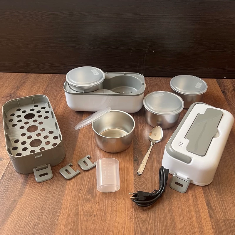 یک قاشق استیل،پیمانه آب،چهار عدد کاسه استیل درب دار و سیم اتصال به برق همراه خودش داره
